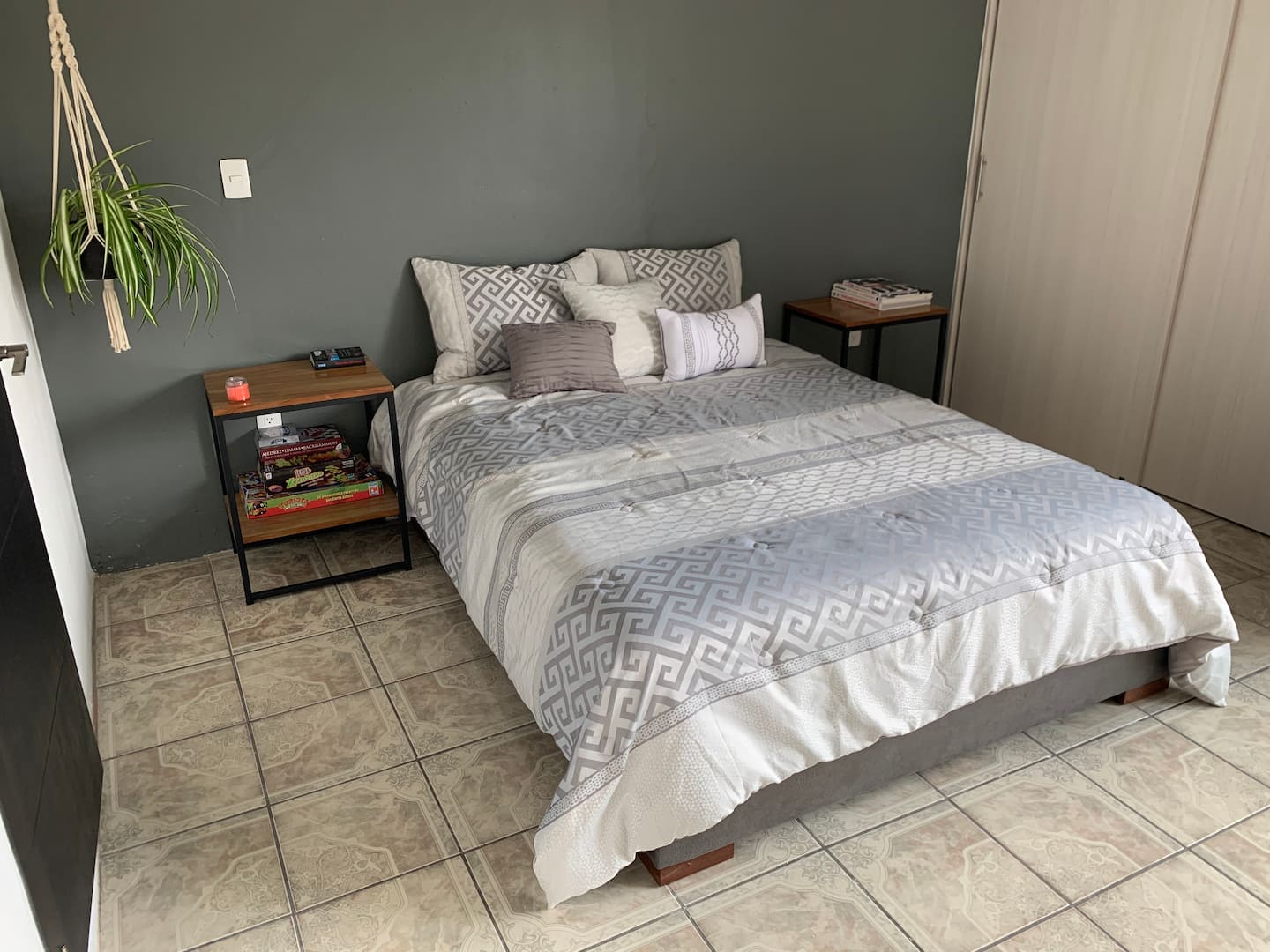 Cama tamaño queen con ropa de cama limpia y cómoda para asegurar un descanso reparador durante tu estancia.